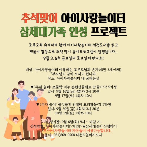 ¾çÁÖ½ÃÀ°¾ÆÁ¾ÇÕÁö¿ø¼¾ÅÍ(¼¾ÅÍÀå ±è±¤ÀÌ)´Â 9¿ù ¼Â°, ´Ù¼¸Â° ÁÖ ±Ý¿äÀϰú Åä¿äÀÏ¿¡ °ü³» ¿µÀ¯¾Æ °¡Á¤À» ´ë»óÀ¸·Î Ãß¼®¸ÂÀÌ »ï¼¼´ë°¡Á· Àμº ÇÁ·ÎÁ§Æ®¸¦ ÁøÇàÇÑ´Ù.