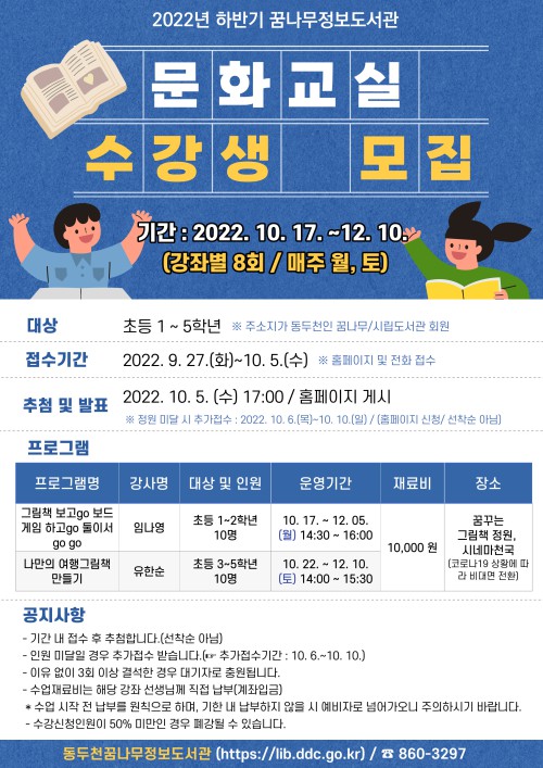 ÇÁ·Î±×·¥ Á¢¼ö´Â 9¿ù 27ÀϺÎÅÍ 10¿ù 5ÀϱîÁö µµ¼°ü ȨÆäÀÌÁö¿Í ÀüÈ·Î ½ÅûÇÒ ¼ö ÀÖÀ¸¸ç, ±âŸ ¹®ÀÇ»çÇ×Àº ÀüÈ(031-860-3297)·Î ¿¬¶ô ¹× ȨÆäÀÌÁö(https://lib.ddc.go.kr)¸¦ Âü°íÇÏ¸é µÈ´Ù.