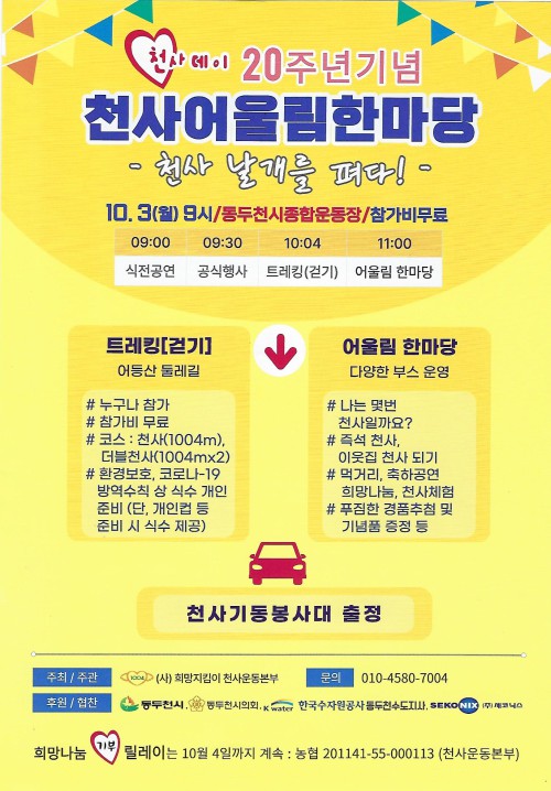 ¿À´Â 10¿ù 3ÀÏ ¿ù¿äÀÏ µ¿µÎõ½Ã Á¾ÇտÀå¿¡¼ õ»çµ¥ÀÌ 20ÁÖ³âÀ» ±â³äÇÏ´Â 'õ»ç¾î¿ï¸² ÇѸ¶´ç'ÀÌ °³ÃֵȴÙ. Çà»ç¸¦ ÁÖ°üÇÏ´Â (»ç)Èñ¸ÁÁöÅ´ÀÌ Ãµ»ç¿îµ¿º»ºÎ´Â ‘õ»ç’ÀÇ ¸¶À½À» °¡Áø ½Ã¹Îµé¿¡°Ô ¿ù 1¸¸¿ø¾¿ ÈÄ¿ø¹Þ¾Æ ¿ì¸® ÁÖº¯ÀÇ ¼Ò¿ÜÀÌ¿ô¿¡°Ô ²ÙÁØÈ÷ »ç¶û ³ª´®À» ½ÇõÇϰí ÀÖ´Â µ¿µÎõ½Ã ´ëÇ¥ Èñ¸ÁÀç´ÜÀÌ´Ù.