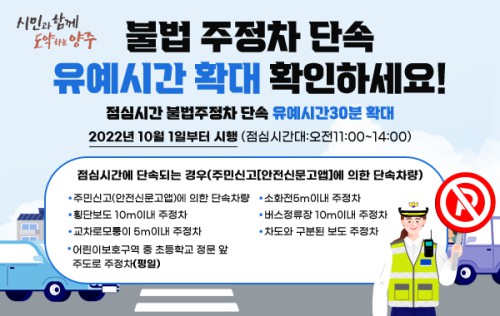 ¾çÁÖ½Ã(½ÃÀå °¼öÇö)´Â ¿À´Â 10¿ù 1ÀϺÎÅÍ Á¡½É½Ã°£ ÁÖÁ¤Â÷ ´Ü¼ÓÀ¯¿¹ ½Ã°£À» È®´ë ¿î¿µÇÑ´Ù.