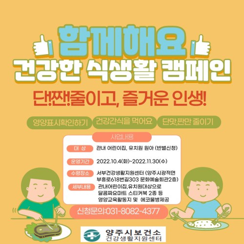 ¾çÁֽà °Ç°»ýȰÁö¿ø¼¾ÅÍ´Â ¿À´Â 10¿ù 4ÀϺÎÅÍ 11¿ù 30ÀϱîÁö °ü³» À¯¾Æ ¹× ¾î¸°À̸¦ ´ë»óÀ¸·Î ‘ÇÔ²²ÇØ¿ä, °Ç°ÇÑ ½Ä»ýȰ±³½Ç’À» ¿î¿µÇÑ´Ù.