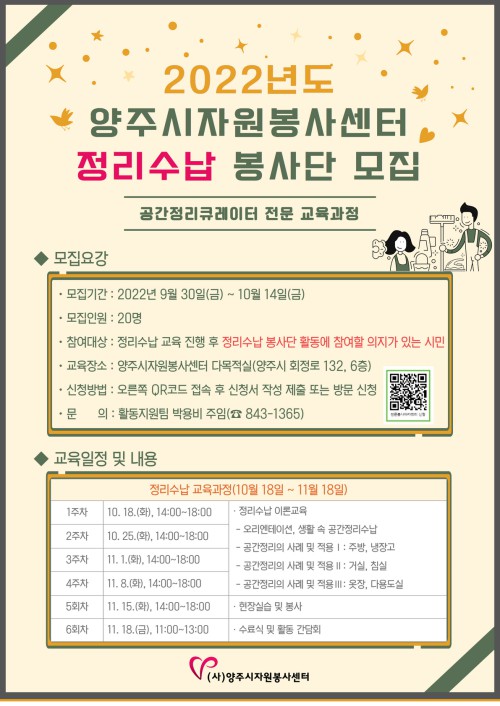 (»ç)¾çÁÖ½ÃÀÚ¿øºÀ»ç¼¾ÅÍ(¼¾ÅÍÀå ±è¿ëÈÆ)´Â 10¿ù 14ÀϱîÁö ‘Á¤¸®¼ö³³ ±³À°°úÁ¤’¿¡ Âü¿©ÇÒ ½Å±ÔÀÚ¿øºÀ»çÀÚ¿Í ÀϹݺÀ»ç´Üü ȸ¿ø 20¸íÀ» ¼±Âø¼øÀ¸·Î ¸ðÁýÇÑ´Ù.
