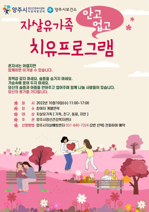 ÀÌ¿¡ ¾çÁֽô ÀÚ»ìÀ¯°¡Á·ÀÇ ¾î·Á¿ò°ú ¾ÆÇÄÀ» ÇÔ²² ³ª´©°í Ä¡À¯ÇÒ ¼ö ÀÖ´Â ÀÚ¸®¸¦ ¸¶·ÃÇØ Á¤»óÀûÀÎ ¾Öµµ °úÁ¤¿¡ µµ¿òÀ» ÁÖ°í ÀÚ±â Ä¡À¯¿Í »îÀÇ Èñ¸ÁÀ» ȸº¹ÇÒ ¼ö ÀÖµµ·Ï ÀÚ»ìÀ¯°¡Á· Ä¡À¯ÇÁ·Î±×·¥ ‘¾È°í ¾÷°í’¸¦ ÁøÇàÇÑ´Ù.