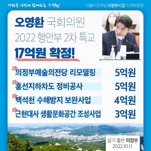 ¿À¿µÈ¯ ±¹È¸ÀÇ¿ø(´õºÒ¾î¹ÎÁÖ´ç, ÀÇÁ¤ºÎ½Ã °©)Àº 2022³âµµ ÇàÁ¤¾ÈÀüºÎ 2Â÷ Ưº°±³ºÎ±Ý 17¾ï¿øÀÌ È®Á¤µÆ´Ù°í 11ÀÏ ¹àÇû´Ù.