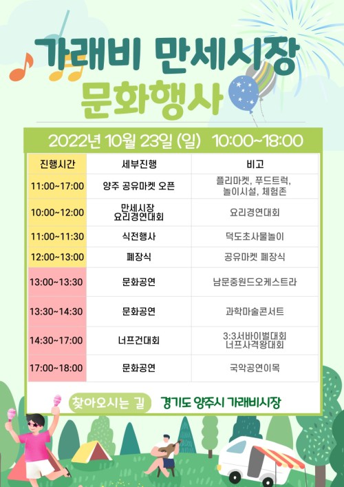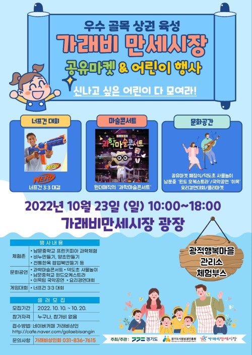 °¡·¡ºñ¸¸¼¼½ÃÀå °øÀ¯¸¶ÄÏ & ¾î¸°ÀÌÇà»ç´Â Áö¿ªÀÇ ´Ù¾çÇÑ °æÁ¦ÁÖü°¡ Âü¿©ÇØ ½ÃÀå°ú ÁÖº¯ »ó±ÇÀÌ È°¼ºÈµÉ ¼ö ÀÖµµ·Ï ¼Ò»ó°øÀÎ °æÀï·ÂÀ» ³ôÀ̱â À§ÇÑ »ç¾÷À¸·Î À̹øÀÌ ¿ÃÇØ ¸¶Áö¸· Çà»ç°¡ µÈ´Ù.