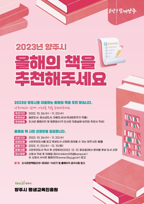 ¾çÁÖ½Ã(½ÃÀå °¼öÇö)´Â ¿À´Â 23ÀϱîÁö Ã¥À¸·Î Çϳª µÇ´Â ‘Ã¥ Àд µµ½Ã ¾çÁÖ’ Á¶¼ºÀ» À§ÇØ ‘2023³â ¾çÁֽà ¿ÃÇØÀÇ Ã¥’À» Ãßõ¹Þ´Â´Ù.