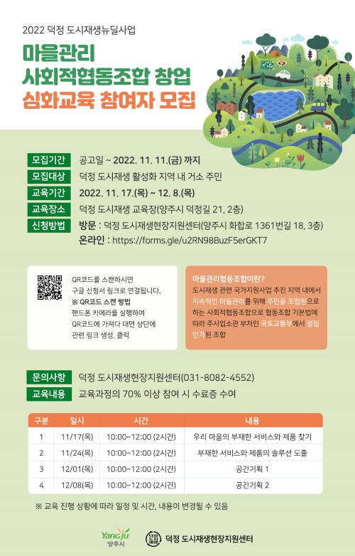¾çÁֽô ¿À´Â 11ÀϱîÁö ´öÁ¤ µµ½ÃÀç»ýÇöÀåÁö¿ø¼¾ÅÍ¿¡¼ ‘´öÁ¤ ¸¶À»°ü¸®»çȸÀûÇùµ¿Á¶ÇÕ Ã¢¾÷ ½ÉȰúÁ¤’¿¡ Âü¿©ÇÒ Áö¿ªÁÖ¹ÎÀ» ¸ðÁýÇÑ´Ù°í ¹àÇû´Ù.