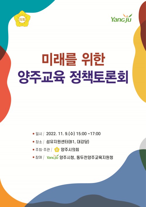 ¾çÁÖ½ÃÀÇȸ(ÀÇÀå À±Ã¢Ã¶)°¡ ¾çÁֽà ¹Ì·¡±³À° ¹ßÀü¹æÇâÀ» ¸ð»öÇϰí, ´õ ³ªÀº ±³À°È¯°æÁ¶¼ºÀ» À§ÇÑ Á¤Ã¥Åä·Ðȸ¸¦ 9ÀÏ ¿ÀÈÄ 3½Ã¿¡ °³ÃÖÇÑ´Ù.