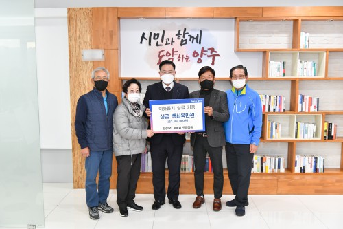 ¾çÁÖ½Ã(½ÃÀå °¼öÇö)´Â Áö³ 9ÀÏ ¹æ¼º2¸® ÁÖ¹ÎÀϵ¿(ÀÌÀå ±è¼º±Ô)ÀÌ ½ÃûÀ» ¹æ¹®ÇØ Àú¼ÒµæÃþÀ» µ½±â À§ÇØ ¼º±Ý 160¸¸¿øÀ» ±âºÎÇß´Ù°í ¹àÇû´Ù.