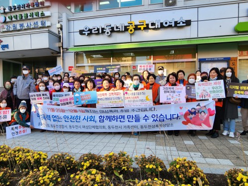Çà»ç¿¡ Âü¼®ÇÑ µ¿µÎõ½Ã ¿©¼º´ÜüÇùÀÇȸ ÀÌÀ¯È ȸÀåÀº “»çȸ °÷°÷¿¡ ´Ù¾çÇÑ ÇüÅÂÀÇ Æø·ÂÀ¸·Î ÀÎÇØ °íÅë¹Þ°í ÀÖ´Â »ç¶÷µéÀÌ ¸¹¾ÆÁö°í ÀÖ°í, ´õ ÀÌ»ó ¸ð¸¥ ô Áö³ªÄ¡´Â ³²ÀÇ ÀÏÀÌ ¾Æ´Ï´Ù”¶ó¸ç “°¡Á·°ú ÀÌ¿ôÀÌ ¾î¶² ÇüÅÂÀÇ Æø·ÂÀÌµç °íÅë¹ÞÁö ¾Êµµ·Ï ¸¹Àº °ü½ÉÀÌ ÇÊ¿äÇÏ´Ù. À̹ø Ä·ÆäÀÎÀ» ÅëÇØ µ¿µÎõ ½Ã¹Î ¸ðµÎ°¡ Æø·Â ¿¹¹æ¿¡ ´ëÇÑ ¿Ã¹Ù¸¥ ÀνÄÀ» °®´Â °è±â°¡ µÇ±â¸¦ ¹Ù¶õ´Ù”¶ó°í ÀüÇß´Ù.