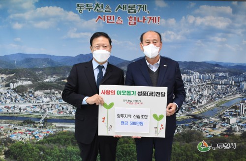 ¾çÁÖÁö¿ª»ê¸²Á¶ÇÕ(Á¶ÇÕÀå ÀÌŹ®)Àº Áö³ 2ÀÏ µ¿µÎõ½Ã(½ÃÀå ¹ÚÇü´ö)¸¦ ¹æ¹®ÇØ Áö¿ª»çȸ ¾î·Á¿î ÀÌ¿ôµéÀ» À§ÇÑ ¼º±Ý 500¸¸¿øÀ» Àü´ÞÇß´Ù.