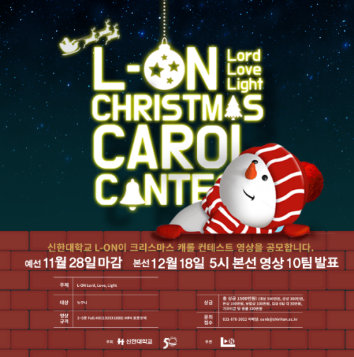 ´©±¸³ª Âü¿©ÇÒ ¼ö ÀÖÀ¸¸ç Å©¸®½º¸¶½º ij·Ñ·Î ´í½º, ¿¬ÁÖ, Âù¾ç µîÀ¸·Î ±¸¼ºµÈ 3~5ºÐ ±æÀÌÀÇ ¿µ»óÀ¸·Î ½ÅÇÑ´ëÇб³ L-ON À¯Æ©ºê ä³ÎÀ» ÅëÇØ Âü°¡ÇÒ ¼ö ÀÖ´Ù. Æí°î, ÀÛ°îµµ °¡´ÉÇÏ¸ç ³ë·¡³ª ·¦, ¾ÆÄ«Æç¶ó µî ¿©·¯ À帣·Î Âü°¡°¡ °¡´ÉÇÏ´Ù. ¼ö»óÀÚ´Â ¿¹¼±°ú Ãß°¡¿¹¼± º»¼±À» ÅëÇØ 10ÆÀÀ» ¼±¹ßÇÒ ¿¹Á¤ÀÌ´Ù.