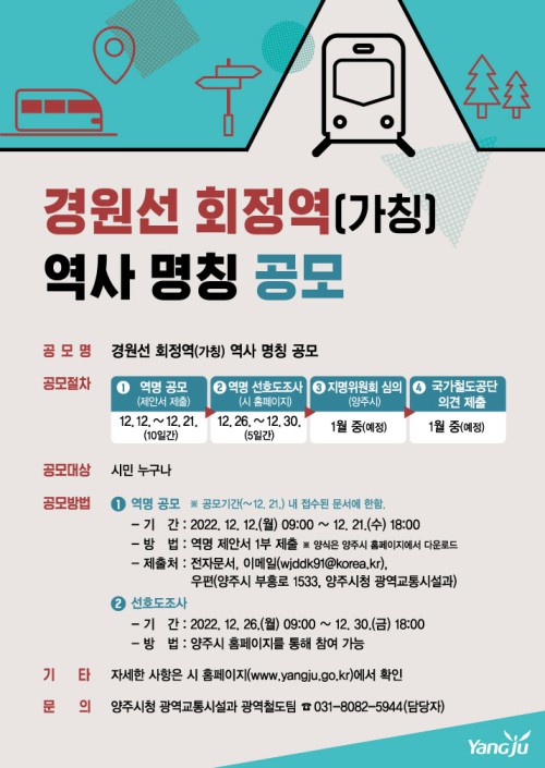 ¾çÁÖ½Ã(½ÃÀå °¼öÇö)´Â ȸÁ¤µ¿ 698¹øÁö ÀÏ¿ø¿¡ ½Å¼³µÇ´Â ȸÁ¤¿ª(°¡Äª)¿¡ ´ëÇÑ ¿ª¸í Á¦Á¤À» À§ÇØ ¾çÁֽùÎÀ» ´ë»óÀ¸·Î ¸íĪ °ø¸ð¸¦ ½Ç½ÃÇÑ´Ù.