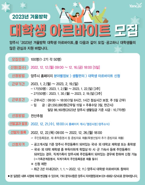 ¾çÁÖ½Ã(½ÃÀå °¼öÇö)´Â 12ÀϺÎÅÍ ¿À´Â 16ÀϱîÁö 2023³â °Ü¿ï¹æÇÐ ´ëÇлý ¾Æ¸£¹ÙÀÌÆ®¸¦ 100¸í ¸ðÁýÇÑ´Ù.