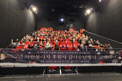 ¾çÁֽÿÁÁ¤Á¾ÇÕ»çȸº¹Áö°ü(°üÀå äÁ¤¼±)Àº Áö³ 14ÀÏ 2022³â ÇÑ ÇØ µ¿¾È Áö¿ªº¹Áö ÁõÁøÀ» À§ÇØ ³ª´® ½Çõ¿¡ ¾ÕÀå¼± ÀÚ¿øºÀ»çÀÚ¿Í ÈÄ¿øÀڵ鿡°Ô °¨»çÀÇ ¸¶À½À» ÀüÇϱâ À§ÇØ CGV ¾çÁÖ¿ÁÁ¤Á¡¿¡¼ °¨»ç¼Û³âÇà»çÀÎ ‘°í(Go)¹é(Back)µ¥ÀÌ’¸¦ °³ÃÖÇß´Ù.