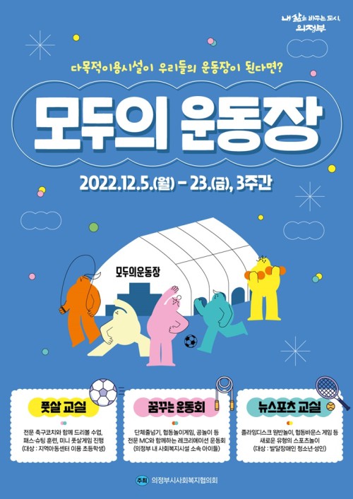 ÀÇÁ¤ºÎ½Ã´Â ´Ù¸ñÀûÀÌ¿ë½Ã¼³¿¡¼ ¾Æµ¿, û¼Ò³â, ³ëÀÎ, Àå¾ÖÀÎ ±¸ºÐ ¾øÀÌ ½Ã¹Î ´©±¸³ª üÀ°È°µ¿À» Áñ±â´Â <¸ðµÎÀÇ ¿îµ¿Àå> ÇÁ·Î±×·¥À» 12¿ù ÇÑ ´Þ°£ ÁøÇàÇÑ´Ù°í ¹àÇû´Ù.