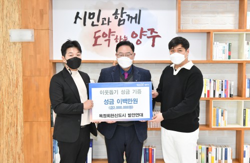 ¾çÁÖ½Ã(½ÃÀå °¼öÇö) Áö³ 23ÀÏ ¿ÁÁ¤È¸Ãµ½Åµµ½Ã ¹ßÀü¿¬´ë(ȸÀå ÃÖ½ÂÇÏ)°¡ ½ÃûÀ» ¹æ¹®ÇØ Àú¼ÒµæÃþÀ» µ½±â À§ÇÑ ¼º±Ý 200¸¸¿øÀ» ±âºÎÇß´Ù°í ¹àÇû´Ù.