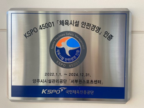¾çÁÖµµ½Ã°ø»ç(»çÀå ÀÌÈï±Ô) ¼ºÎ±Ç½ºÆ÷Ã÷¼¾ÅͰ¡ üÀ°½Ã¼³ ¾ÈÀü°æ¿µ ÀÎÁõ(KSPO 45001)ÀÇ 2022³â ÀÎÁõ »çÈĽɻ縦 Åë°úÇÏ¿© ÀûÇÕ ÆÇÁ¤À» ¹Þ¾Ò´Ù.
