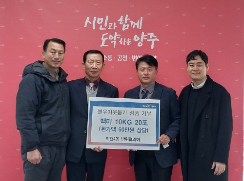 ¾çÁֽà ȸõ4µ¿ ÇàÁ¤º¹Áö¼¾ÅÍ(µ¿Àå ÀÌâ¿)´Â Áö³ 27ÀÏ ¿¬¸»¿¬½Ã¸¦ ¸Â¾Æ ȸõ4µ¿ ¹æÀ§ÇùÀÇȸ(ȸÀå ¹è½Â¼ö)¿¡¼ ½Ò(10kg) 20Æ÷¸¦ ±âºÎÇß´Ù°í ¹àÇû´Ù.