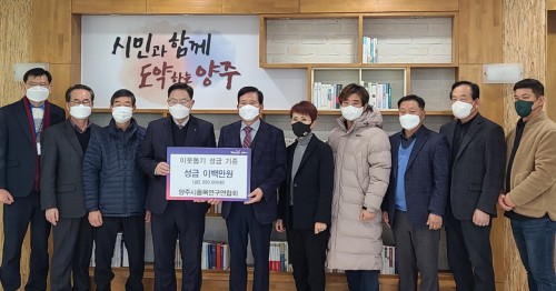 ¾çÁÖ½Ã(½ÃÀå °¼öÇö)´Â Áö³ 12¿ù 29ÀÏ ¾çÁÖ½Ãǰ¸ñ¿¬±¸¿¬ÇÕȸ(ȸÀå ¹Ú¼ø¿ë)¿¡¼ Áö¿ª»çȸ ¾î·Á¿î ÀÌ¿ôµé°ú ¿ÂÁ¤À» ³ª´©±â À§ÇØ ¾çÁֽÿ¡ ¼º±Ý 200¸¸¿øÀ» ±âºÎÇß´Ù°í ¹àÇû´Ù.