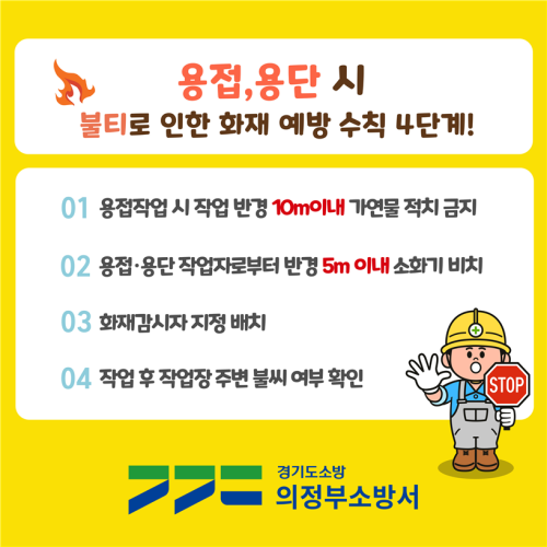 ÀÇÁ¤ºÎ¼Ò¹æ¼(¼Àå À¯Çذø)´Â °Ü¿ïö °Ç¼³ÇöÀå ÈÀç ¿¹¹æÀ» À§ÇØ ¿ëÁ¢·¿ë´Ü ÀÛ¾÷ Áß ºÒƼ·Î ÀÎÇÑ ÈÀç ¿¹¹æ¿¡ °¢º°ÇÑ ÁÖÀǸ¦ ´çºÎÇÑ´Ù°í ¹àÇû´Ù.