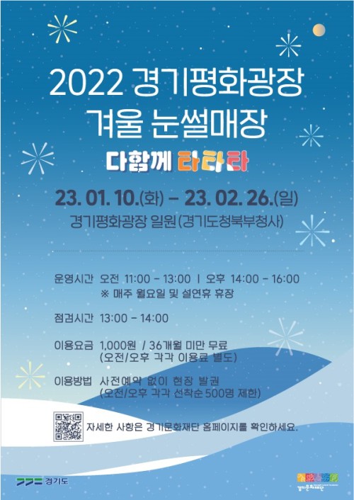 ÀÌ¿Í ÇÔ²² °æ±âÆòȱ¤Àå Àܵð±¤Àå¿¡¼´Â 1¿ù 10ÀϺÎÅÍ 2¿ù 26ÀϱîÁö 40Àϰ£ ‘´«½ä¸ÅÀå’À» ¿î¿µÇÑ´Ù. À̹ø Çà»ç´Â Äڷγª ¿©ÆÄ·Î ÀÎÇØ 2³â ¸¸¿¡ °³ÀåÇÏ´Â °ÍÀ¸·Î ÁÖ¸»À» Æ÷ÇÔÇÏ¿© ¿ÀÀü 11½ÃºÎÅÍ ¿ÀÈÄ 4½Ã±îÁö 1ȸ´ç 120ºÐ¾¿ 2ȸ¿¡ °ÉÃÄ ¿î¿µµÇ¸ç(Á¡°Ë½Ã°£: 13½ÃºÎÅÍ 14½Ã), ¸ÅÁÖ ¿ù¿äÀÏ¿¡´Â ÈÞÀåÇÑ´Ù.