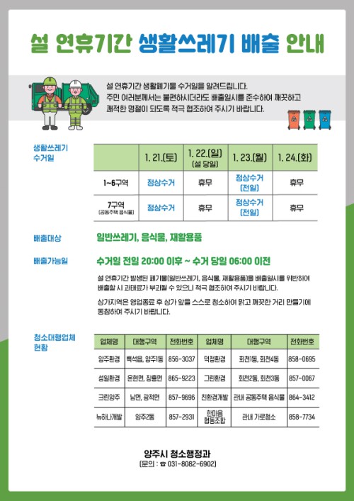 ¾çÁÖ½Ã(½ÃÀå °¼öÇö)´Â ¼³ ¿¬ÈÞ ±â°£ »ýȰ¾²·¹±â·Î ÀÎÇÑ ½Ã¹Î ºÒÆí ÇØ¼Ò¿Í û°áÇÑ ¸íÀý ºÐÀ§±â Á¶¼ºÀ» À§ÇØ ‘¼³ ¿¬ÈÞ »ýȰ¾²·¹±â °ü¸®´ëÃ¥’À» ÃßÁøÇÑ´Ù.