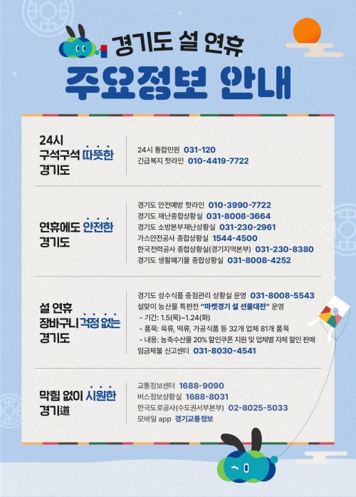 µµ´Â 21ÀϺÎÅÍ 24ÀϱîÁö ‘¼³ ¿¬ÈÞ Á¾ÇÕ»óȲ½Ç’À» ¿î¿µÇØ Á¾Çվȳ»¿Í µµ¹Î ºÒÆí »çÇ׿¡ Áï°¢ÀûÀ¸·Î ´ëÀÀÇÒ °èȹÀÌ´Ù. ¿¬ÈޱⰣ ¹ß»ýÇÏ´Â °¢Á¾ ºÒÆí »çÇ×Àº ‘120 °æ±âµµÄݼ¾ÅÍ(031-120)’·Î ½Å°íÇÒ ¼ö ÀÖ´Ù. ¼¾ÅÍ´Â °¢Á¾ ºÒÆí »çÇ× Á¢¼ö´Â ¹°·Ð ±³ÅëÁ¤º¸ ¹× ÀÀ±ÞÀÇ·á±â°ü µîÀ» ¾È³»ÇÑ´Ù. ¾ÈÀü¿¹¹æÇÖ¶óÀÎ(010-3990-7722)°ú ±ä±Þº¹ÁöÇÖ¶óÀÎ(010-4419-7722)µµ »ó½Ã °¡µ¿ÇÑ´Ù.