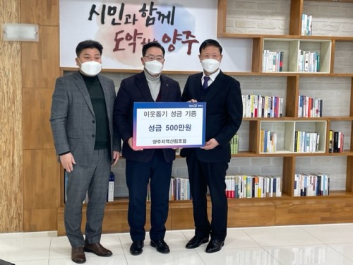 ¾çÁÖ½Ã(½ÃÀå °¼öÇö)´Â 20ÀÏ ¾çÁÖÁö¿ª»ê¸²Á¶ÇÕ(Á¶ÇÕÀå ÀÌŹ®)¿¡¼ ½ÃûÀ» ¹æ¹®ÇØ ¼³ ¸íÀýÀ» ¸Â¾Æ ¼º±Ý 500¸¸¿øÀ» ±âºÎÇß´Ù°í ¹àÇû´Ù.