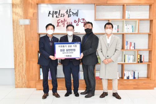 ¾çÁÖ½Ã(½ÃÀå °¼öÇö)´Â 20ÀÏ ¢ß¸¶Æ®Å·(´ëÇ¥ ±èÈñºÀ)¿¡¼ ½ÃûÀ» ¹æ¹®ÇØ Àú¼ÒµæÃþÀ» µ½±â À§ÇØ ¼º±Ý 3õ¸¸¿øÀ» ±âºÎÇß´Ù°í ¹àÇû´Ù.