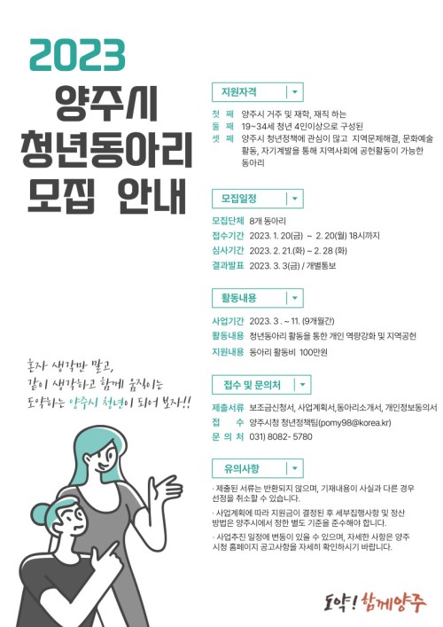 ¾çÁÖ½Ã(½ÃÀå °¼öÇö)´Â ¿À´Â 2¿ù 20ÀϱîÁö ‘2023³â û³âµ¿¾Æ¸® Áö¿ø»ç¾÷’¿¡ Âü¿©ÇÒ Ã»³âµ¿¾Æ¸® 8ÆÀÀ» ¸ðÁýÇÑ´Ù.