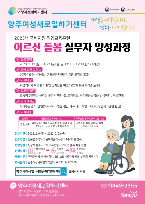 ¾çÁÖ¿©¼º»õ·ÎÀÏÇϱ⼾ÅÍ´Â ¿À´Â 2¿ù 23ÀϱîÁö ¿ä¾çº¸È£»ç·Î Ãë¾÷À» Èñ¸ÁÇÏ´Â ¿©¼ºÀ» ´ë»óÀ¸·Î Á÷¾÷±³À°ÈÆ·Ã ‘¾î¸£½Å µ¹º½ ½Ç¹«ÀÚ ¾ç¼º°úÁ¤’¿¡ Âü¿©ÇÒ ¼ö°»ýÀ» ¸ðÁýÇÑ´Ù.