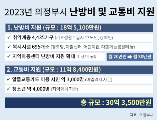 2023³â º¹Áö¿Í ±³Åë ºÐ¾ß·Î Áö¿øµÇ´Â ÀÇÁ¤ºÎ½Ã ¿¹»êÀº ±¹µµºñ¸¦ Æ÷ÇÔÇÏ¿© ÃÑ 30¾ï 3õ5¹é¸¸ ¿øÀ¸·Î Ãë¾à°èÃþ 4,435¼¼´ë, º¹Áö½Ã¼³ 695°³¼Ò, û¼Ò³â µî 7,000¿© ¸íÀÌ Áö¿ø¹Þ´Â´Ù.
