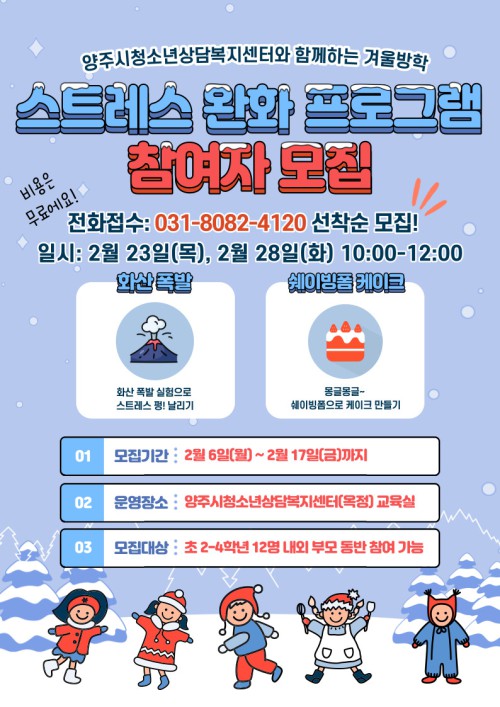 ¾çÁÖ½Ãû¼Ò³â»ó´ãº¹Áö¼¾ÅÍ(¼¾ÅÍÀå ÀÌ»óÇö)´Â 6ÀϺÎÅÍ ¿À´Â 17ÀϱîÁö °ü³» û¼Ò³âÀ» ´ë»óÀ¸·Î ÁøÇàÇÏ´Â °Ü¿ï¹æÇÐ Áý´Ü»ó´ã ‘½ºÆ®·¹½º ¿ÏÈ ÇÁ·Î±×·¥’ Âü°¡ÀÚ¸¦ ¸ðÁýÇÑ´Ù.