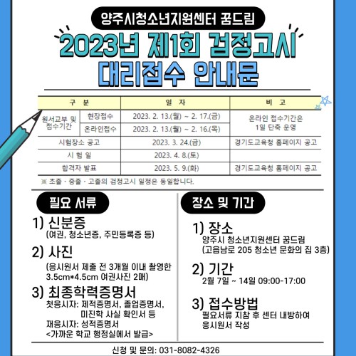 ¾çÁÖ½Ãû¼Ò³âÁö¿ø¼¾ÅÍ ²Þµå¸²Àº Çб³ ¹Û û¼Ò³âµéÀ» À§ÇØ 2023³â Á¦1ȸ ÃÊ·Áß·°í Á¹¾÷ Çз °ËÁ¤°í½Ã ÀÀ½Ã Á¢¼ö ´ëÇàÀ» Áö¿øÇÑ´Ù°í ¹àÇû´Ù.