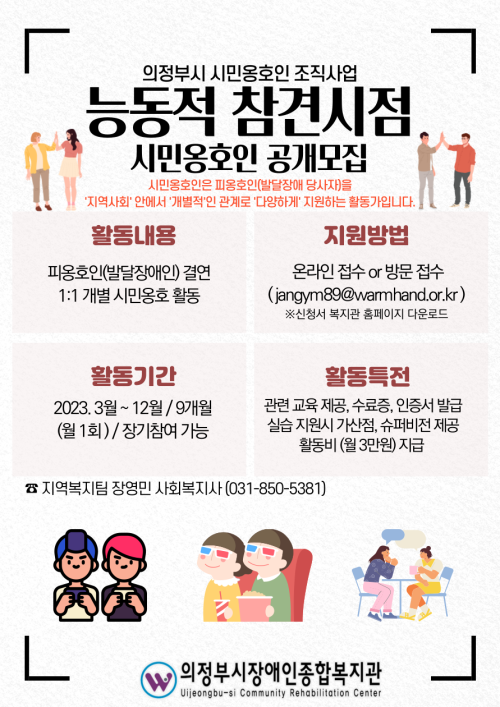 ¸ÕÀú, ¼ºÀιߴÞÀå¾ÖÀÎÀÇ °³º°Àû ¿ËÈ£Áö¿øÃ¼°è ±¸ÃàÀ» À§ÇÑ ÀÇÁ¤ºÎ½Ã ½Ã¹Î¿ËÈ£ÀÎ Á¶Á÷»ç¾÷ ‘´Éµ¿Àû Âü°ß ½ÃÁ¡’Àº ÇÇ¿ËÈ£ÀÎ(¹ß´ÞÀå¾Ö ´ç»çÀÚ)°ú 1:1·Î °á¿¬ÇÏ¿© ÀÌ¿ô °ü°è¸¦ ¸Î¾î ´Ù¾çÇÑ È°µ¿À» Áö¿øÇÏ´Â ½Ã¹Î¿ËÈ£ÀÎÀ» ¸ðÁýÇϰí ÀÖ´Ù.