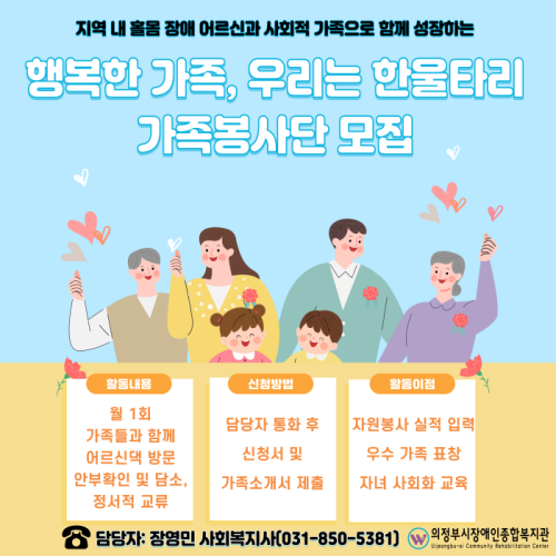 µÎ ¹øÂ°, °í·É·È¦¸öÀå¾ÖÀÎÀÇ Áö¿ª»çȸ µ¹º½Ã¼°è ±¸ÃàÀ» À§ÇÑ °¡Á·ºÀ»ç´Ü Á¶Á÷»ç¾÷ ‘ÇູÇÑ °¡Á·, ¿ì¸®´Â Çѿ®’´Â Ȧ¸ö Àå¾Ö¾î¸£½Å°ú 1:1·Î °á¿¬ÇÏ´Â °¡Á· ´ÜÀ§ÀÇ ºÀ»ç´ÜÀ» ¸ðÁýÇϰí ÀÖ´Ù.