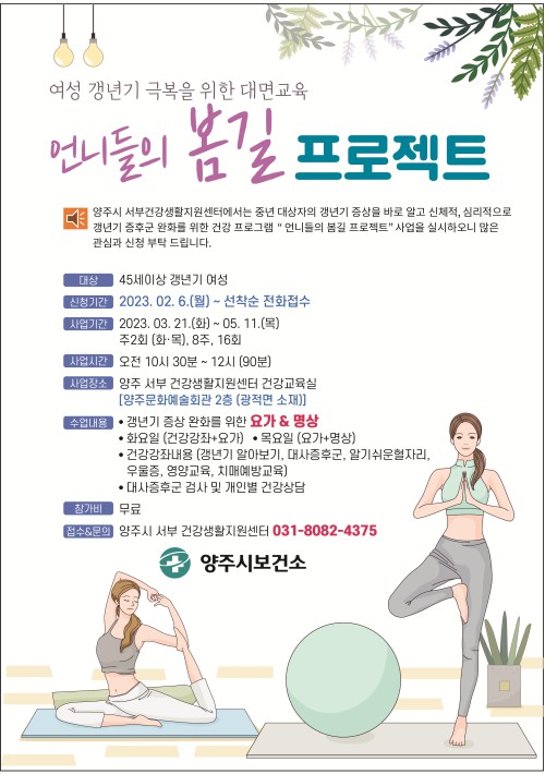 ¾çÁֽà º¸°Ç¼Ò(¼ÒÀå ÀÌÀçȯ) ¼ºÎ °Ç°»ýȰÁö¿ø¼¾ÅÍ¿¡¼ 40¼¼~60¼¼ °»³â±â Áõ»óÀ» È£¼ÒÇÏ´Â ¿©¼ºÀ» ´ë»óÀ¸·Î ÇÑÀǾà°Ç°ÁõÁøÇÁ·Î±×·¥ ‘¾ð´ÏµéÀÇ º½±æ ÇÁ·ÎÁ§Æ®’ Âü¿©ÀÚ¸¦ ¼±Âø¼ø ¸ðÁýÇÑ´Ù.