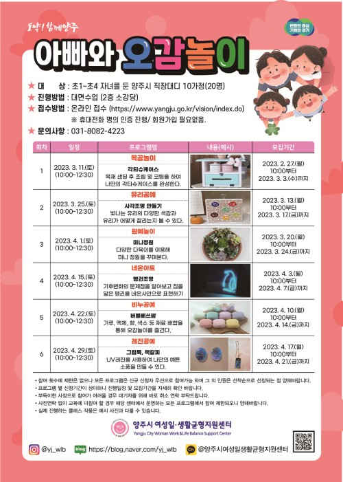 ½Ã °ü°èÀÚ´Â “Àڳ࿡°Ô ´õ Ä£±ÙÇÏ°Ô ´Ù°¡°¡°í ½ÍÁö¸¸, À°¾Æ¿¡ ¾î·Á¿òÀ» °Þ´Â Á÷Àå ¾Æºü¿¡°Ô À̹ø ÇÁ·Î±×·¥À» ÅëÇØ ÀÚ³à¿Í ¼ÒÅëÇÒ ¼ö ÀÖ´Â ½Ã°£ÀÌ µÇ±æ ¹Ù¶õ´Ù”¸ç “5¿ùºÎÅÍ ÁøÇàµÉ ¿¹Á¤ÀΑ¾Æºü¿Í ¿ä¸®Äî Á¶¸®Äî’ ÇÁ·Î±×·¥ µî ´Ù¾çÇÑ °¡Á·°£ÀÇ À¯´ë°ü°è ÁõÁøÀ» À§ÇÑ ÇÁ·Î±×·¥À» °è¼ÓÇØ¼ Á¦°øÇÒ °Í”À̶ó°í ¸»Çß´Ù.