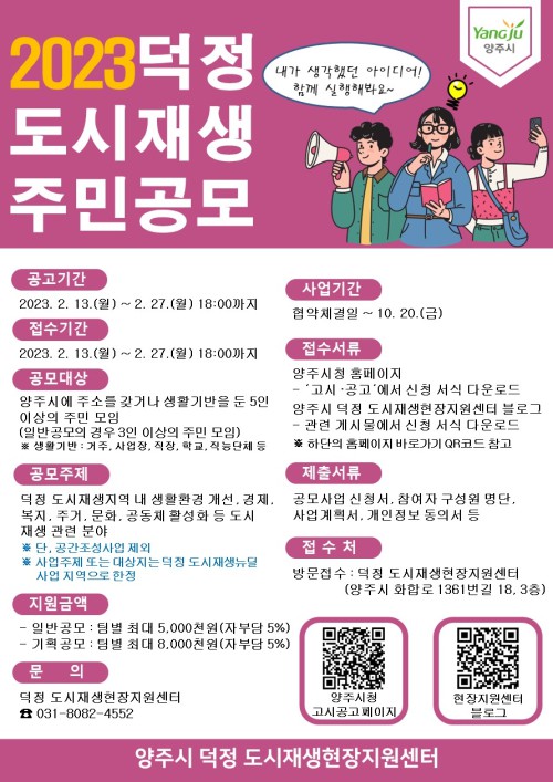 ¾çÁֽà ´öÁ¤ µµ½ÃÀç»ýÇöÀåÁö¿ø¼¾ÅÍ´Â ¿À´Â 27ÀϱîÁö ‘2023³â ´öÁ¤ µµ½ÃÀç»ý Áֹΰø¸ð»ç¾÷’ Âü¿©ÀÚ¸¦ ¸ðÁýÇÑ´Ù.