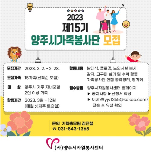 (»ç)¾çÁÖ½ÃÀÚ¿øºÀ»ç¼¾ÅÍ(¼¾ÅÍÀå ±è¿ëÈÆ)´Â °¡Á·°ú ÇÔ²² °Ç°ÇÑ °¡Á·¹®È¸¦ ¸¸µé°í ¾î·Á¿î ÀÌ¿ôÀ» µ½´Â ‘Á¦15±â ¾çÁֽà °¡Á·ºÀ»ç´Ü’À» ¸ðÁýÇÑ´Ù.