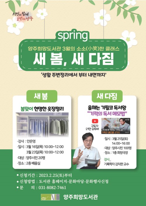 ¾çÁֽà ¾çÁÖÈñ¸Áµµ¼°ü¿¡¼´Â º½À» ¸ÂÀÌÇÏ´Â 3¿ù ‘»õ º½, »õ ´ÙÁü’À̶ó´Â ÁÖÁ¦ ÇÏ¿¡ ¼Ò¼Ò(á³áÅ)ÇÑ Å¬·¡½º¸¦ ¿î¿µÇÑ´Ù.