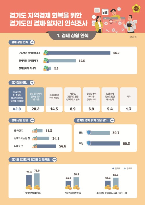 °æ±âµµÀÇȸ(ÀÇÀå ¿°Á¾Çö)°¡ µµ¹ÎÀÇ °æÁ¦»óȲ ü°¨µµ¸¦ ÃøÁ¤Çϰí, ÁֹΠ¸ÂÃãÇü °æÁ¦Á¤Ã¥ ¹æÇâÀ» ¼³Á¤Çϱâ À§ÇØ ½Ç½ÃÇÑ ‘2022³â 5Â÷ °æ±âµµ Áö¿ª°æÁ¦ ȸº¹À» À§ÇÑ °æ±âµµ¹Î °æÁ¦·ÀÏÀÚ¸® ÀνÄÁ¶»ç’ °á°ú¸¦ 2ÀÏ ¹ßÇ¥Çß´Ù.