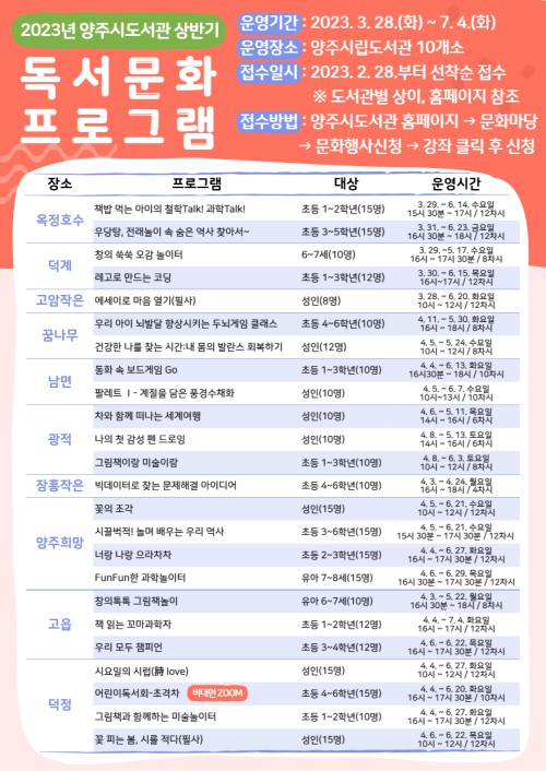 ¾çÁֽõµ¼°üÀº ½Ã¹Î¿¡°Ô µ¶¼¹®È ÇâÀ¯ÀÇ ±âȸ¸¦ Á¦°øÇϱâ À§ÇØ ¿À´Â 28ÀϺÎÅÍ 3°³¿ù°£ ‘2023³â »ó¹Ý±â µ¶¼¹®È ÇÁ·Î±×·¥’¿¡ Âü¿©ÇÒ ¼ö°»ýÀ» ¸ðÁýÇÑ´Ù.