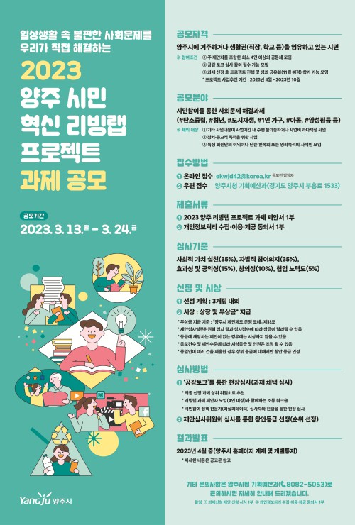 ¾çÁÖ½Ã(½ÃÀå °¼öÇö)°¡ ¿À´Â 13ÀϺÎÅÍ 24ÀϱîÁö ½Ã¹ÎÀÌ Ã¼°¨ÇÒ ¼ö ÀÖ´Â »ýȰ¹ÐÂøÇü »ç¾÷À» ÃßÁøÇϱâ À§ÇØ ‘2023 ¾çÁֽùΠÇõ½Å ¸®ºù·¦ ÇÁ·ÎÁ§Æ®’°úÁ¦¸¦ °ø¸ðÇÑ´Ù.