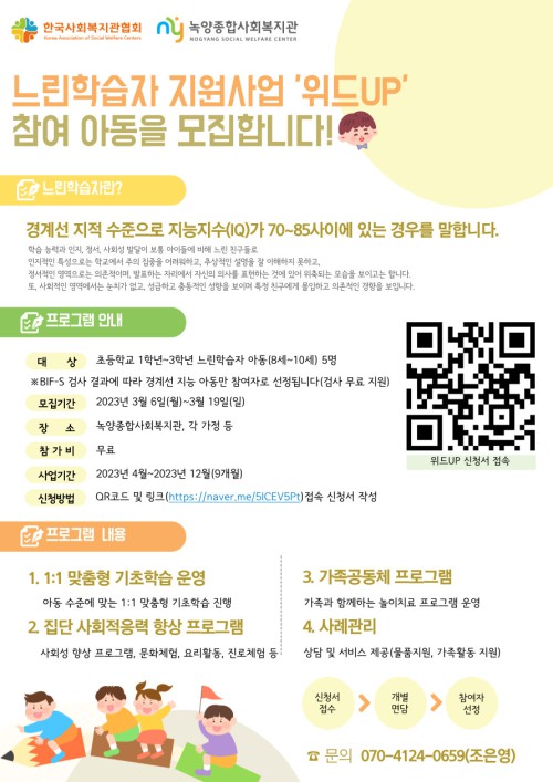 2023³â 3¿ù, »çȸº¹Áö¹ýÀÎ »ç¶û±³À°º¹ÁöÀç´Ü¿¡¼ ¼öŹ ¿î¿µÇÏ´Â ³ì¾çÁ¾ÇÕ»çȸº¹Áö°üÀÌ Çѱ¹»çȸº¹Áö°üÇùȸ·ÎºÎÅÍ 2023³â ´À¸°ÇнÀ ¾Æµ¿ Áö¿ø »ç¾÷ ‘À§µåup’ Áö¿ø±â°ü¿¡ ÃÖÁ¾ ¼±Á¤µÇ¾ú´Ù.