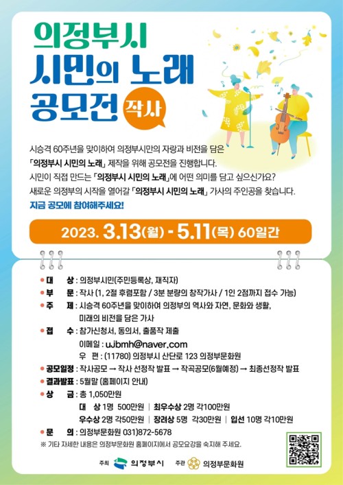 ÇÑÆí, ÀÇÁ¤ºÎ½Ã´Â ¿ÃÇØ 1¿ù ÀÇÁ¤ºÎ½Ã ½Ã¹ÎÀÇ ³ë·¡ Á¦ÀÛ ÃßÁøÀ§¿øÈ¸ ȸÀǸ¦ °³ÃÖÇØ ½Ã¹ÎÀÇ Âü¿©¸¦ ÃÖ´ëÈÇÏ´Â ¹æ¾ÈÀ» ¸ð»öÇß´Ù. °îÀÇ ÁúÀ» ³ôÀ̱â À§ÇØ ÀÛ»ç´Â ÀÇÁ¤ºÎ½Ã¹ÎÀ» ´ë»óÀ¸·Î, ÀÛ°îÀº Àü ±¹¹ÎÀ» ´ë»óÀ¸·Î °ø¸ð¸¦ °³ÃÖÇϱâ·Î Çß´Ù.
