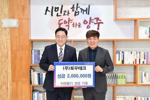 ¾çÁÖ½Ã(½ÃÀå °¼öÇö)´Â Áö³ 15ÀÏ ¢ßÅä¿ìÅ×Å©(´ëÇ¥ ÃÖ»ó¿¬)¿¡¼ ½ÃûÀ» ¹æ¹®ÇØ ¾çÁֽà ¾î·Á¿î ÀÌ¿ôÀ» µ½´Âµ¥ ½á´Þ¶ó¸ç ¼º±Ý 200¸¸¿øÀ» ±âºÎÇß´Ù°í ¹àÇû´Ù.