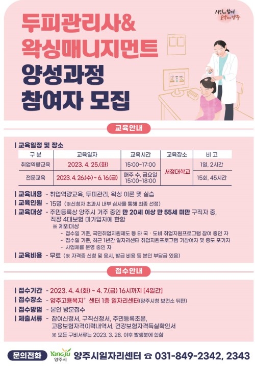 ¾çÁÖ½ÃÀÏÀÚ¸®¼¾ÅÍ´Â ¿À´Â 4¿ù 4ÀϺÎÅÍ 7ÀϱîÁö 2023³â Ãë¾÷Áö¿øÇÁ·Î±×·¥ ‘µÎÇǰü¸®»ç&¿Î½Ì¸Å´ÏÁö¸ÕÆ® ¾ç¼º°úÁ¤’¿¡ Âü¿©ÇÒ ±³À°»ýÀ» ¸ðÁýÇÑ´Ù.