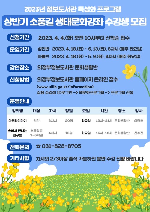 ÀÇÁ¤ºÎ½Ã(½ÃÀå ±èµ¿±Ù) Á¤º¸µµ¼°üÀº ÀÇÁ¤ºÎ Áö¿ª ¸í¼ÒÀÎ ¼Òdz±æ¿¡¼ ÀÚ»ýÇÏ´Â ¾ß»ýÈ¿Í ½Ä¹°µéÀ» ¹è¿ì°í °¨»óÇÏ´Â '»ó¹Ý±â ¼Òdz±æ »ýÅ ¹®È°ÁÂ'¸¦ ¿î¿µÇÑ´Ù.